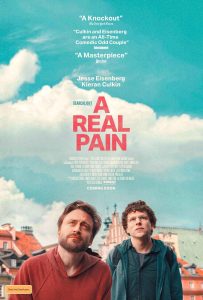 A real pain es una película que consigue hablar sobre el Holocausto sin convertirse en una tragedia que se tome demasiado en serio a sí misma, lo cual es muy complicado de conseguir, y quizás solamente lo logra porque la historia judía se convierte en el escenario que permite interactuar a unos personajes bastante cómicos. Cuando vi su estreno en un cine en Alemania, me maravilló que una película que tratara este tema pudiera hacer reír a una sala entera de alemanes, y creo que eso tiene mucho mérito. (Por cierto, dato de trivial, esta ha sido la primera película de la historia del cine a la que un campo de concentración ha otorgado el permiso de filmar algo de ficción en las premisas mismas del campo.)
