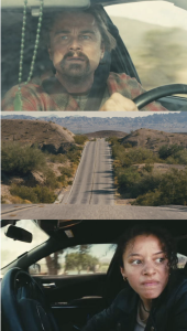 Por último, quiero elogiar la edición de Andy Jurgensen, sobre todo en la última media hora, que en conjunto con las tomas de la carretera, intercaladas con las reacciones de Willa, Bob y Tim (un asesino de los Aventureros de la Navidad), mientras se persiguen por el desierto. ¿Quién atrapará primero a quién? Willa aprovecha estas subidas y bajadas que nos han elevado el pulso cada vez que vemos más cerca el coche rojo: se frena, ¡bum! Tim se estrella. Willa le grita la clave, él no responde correctamente, Willa lo mata y expulsa en un grito toda la frustración que lleva acumulando por días. Escuchamos la melodía en la que debe confiar, Bob le grita “¡Aquí estoy, soy tu papá!”, y finalmente padre e hija se reencuentran. Para mí, esto fue una masterclass de montaje.